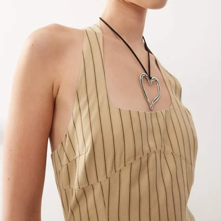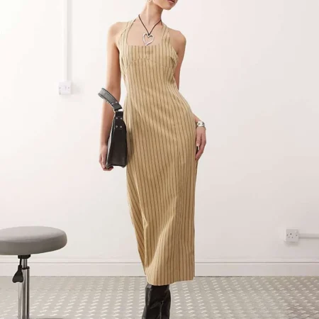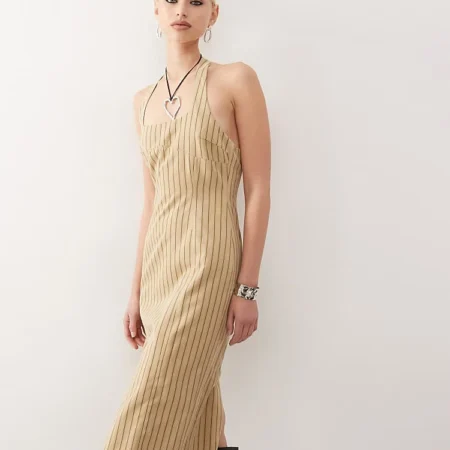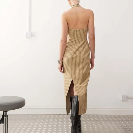 Lioness Halter Neck Back Split Midi Dress In Beige Stripe For Women