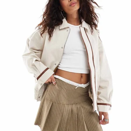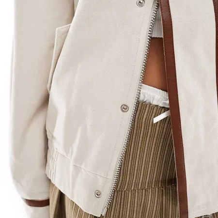 Lioness Collar Detail Bomber Jacket With Leather Look Trim In Beige For Women