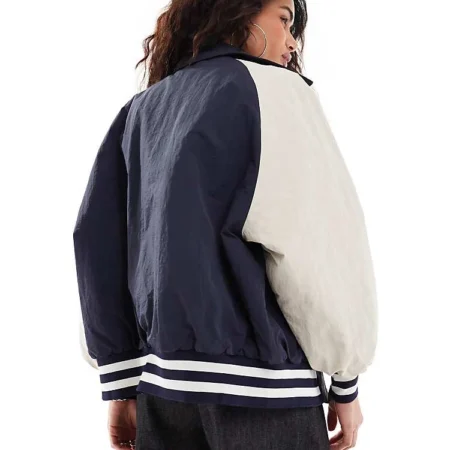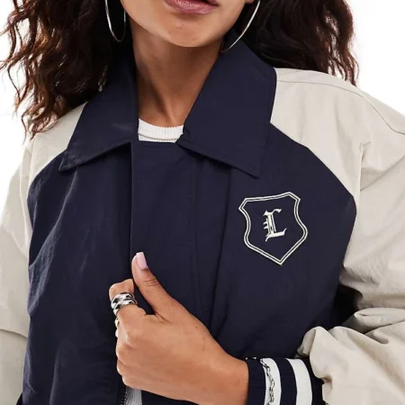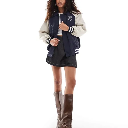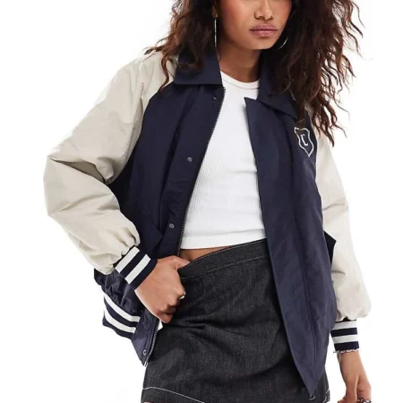 Lioness Collegiate Collar Detail Bomber Jacket With Contrast Sleeves In Navy For Women
