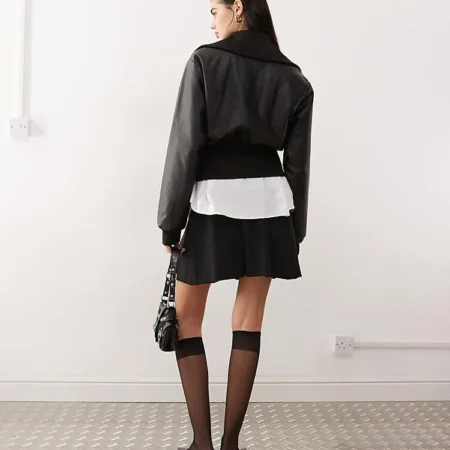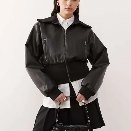 Lioness Cropped Leather Look Elasticated Hem Bomber Jacket In Black For Women