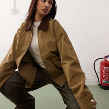 Lioness Contrast Corduroy Collar Canvas Barn Jacket In Chestnut Brown For Women