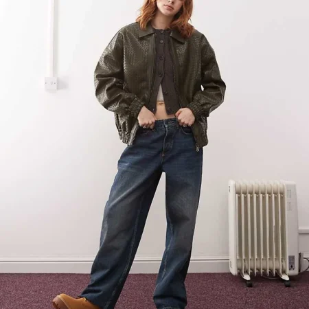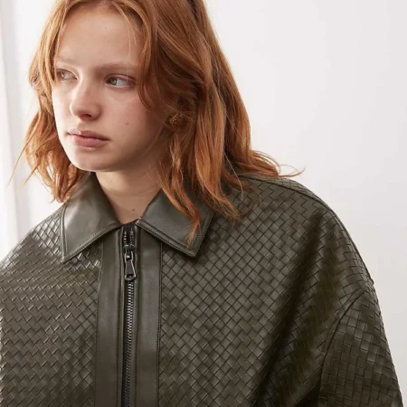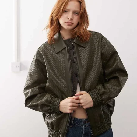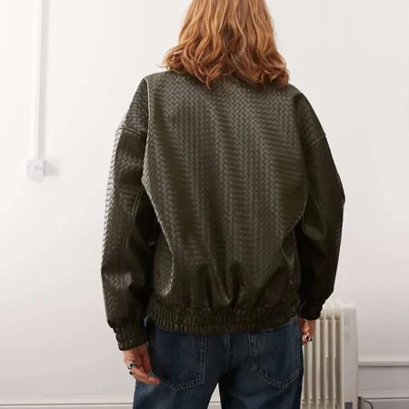 Lioness Exclusive Leather Look Weave Detail Bomber Jacket In Bottle Green For Women