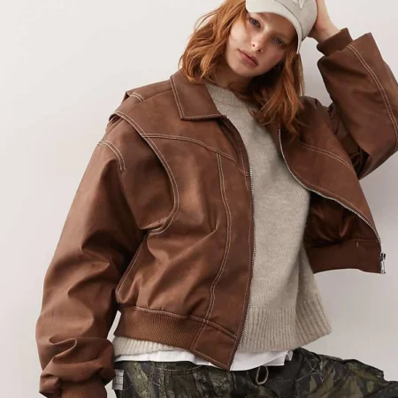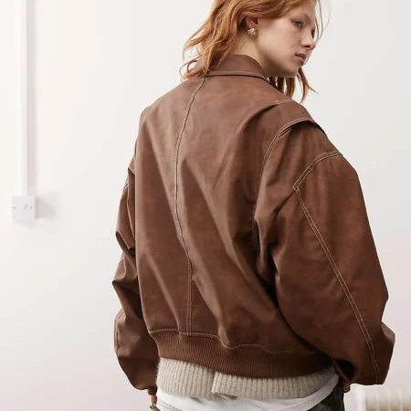 Lioness Exclusive Leather Look Contrast Stitch Bomber Jacket In Washed Brown For Women